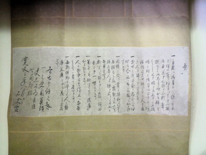 さて、この文書は石川丈山が甥に与えた七ヶ条の覚書とされているものです。おそらく「写し」であって、石川丈山自身の筆ではないでしょう(この時には、別の筆のものも詩仙堂には掲げられていました)。内容は、生きていく上での戒めです。宛先はありませんが、本文には「吾侄」(吾が侄)とあり、おそらく妹の子であり養子であった石川重昌(数馬)に宛てられたものではなかろうかと考えられています。(参考:小川武彦『石川丈山年譜 本編』青裳堂書店、1994年)