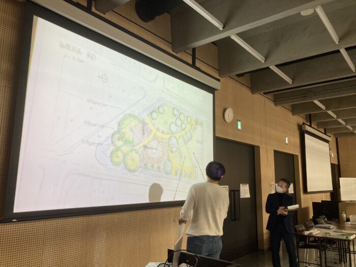2日間の取り組みをコンセプト、ゾーニング、平面図などを基に発表します。ベース(敷地)は同じですが、設計図は各自の個性が色濃く出ます。若い人に向けたスポーツ施設(バスケやフットサルコート)、ストレッチがしたくなるアクティビティ、座りたくなるベンチにフードコートなどさまざまなアイデアが。もちろん実現できたらいいなと思うものもありました。