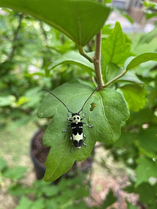 私は昆虫には詳しくないのですが、子供の頃から身近なところにいつも昆虫がいました。最近見た、もっともエキサイティングな昆虫はなんとタキシードを着たパンダのような模様を持つラミーカミキリです。ラミーカミキリはラミー(苧麻)を食べるカミキリ虫とのことで、からむし類にいることが多いそうです。この個体は自宅のムクゲにいました。背中にドクロのような模様がある蛾も見たことがあります。こういったデザインは模様といっていいのか、なんと呼んでいいのか、今度昆虫館に行ったら注目してみます。