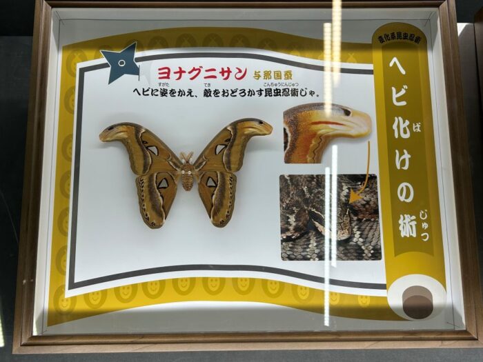 展示の中にヨナグニサンがありました。世界最大級の大きさです。展示では羽の先が蛇の頭のように見えることを説明しています。与那国島に行った際、アヤミハビル館を訪ねました。アヤミハビルはこの地方での呼び方です。蛇の頭のように見える点はあまり強調されていませんでした。