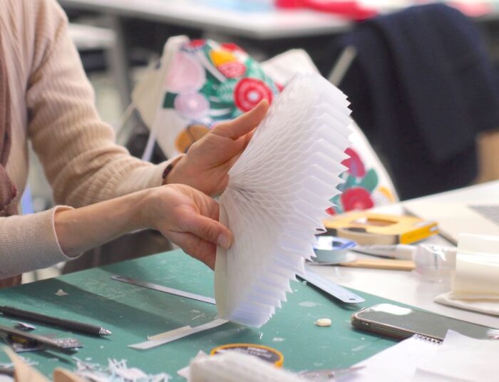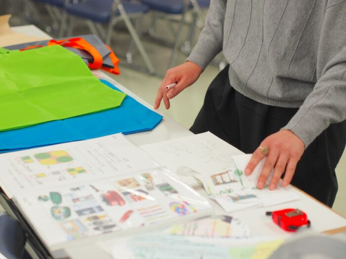 そして、実際に模型を作って素材の特性も確かめながら、使いやすい仕組みや構造を検討します。布、紙、スチレンボード、プラスチックなど、学生によって使用する素材も様々です。