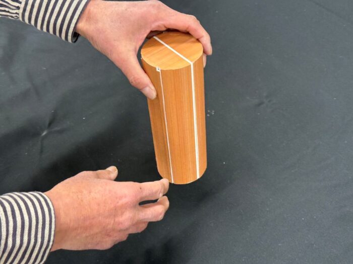 次の写真に写っているモノも、この日の学生の作品なのです。机の上に、水筒が置いてあるように見えますが・・・