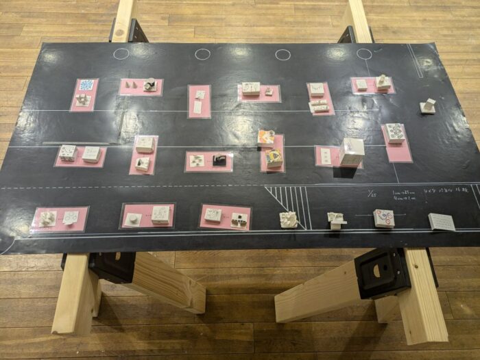 こちらは学生の皆さんが作られた作品のミニチュア模型を、会場の図面に配置したものです。