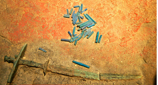 朱は非常に希少価値の高い物質であり、これを大量に入手するためには強大な権力や広範な交易ネットワークが必要です。さらに、この遺構や周辺からは、無文土器、ガラス製管玉、絹製品、鋳造鉄器、有柄式銅剣などが出土しています。ガラス製管玉は外国産の装身具であり、鋳造鉄器は中国東北部に由来する輸入品と考えられています。