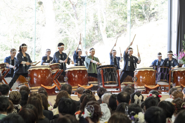 つづいて、通学部学生サークル「和太鼓 悳(わだいこ しん)」の祝奏です。身体全体で感じる、晴れの日にふさわしい和太鼓が会場に響き渡りました。