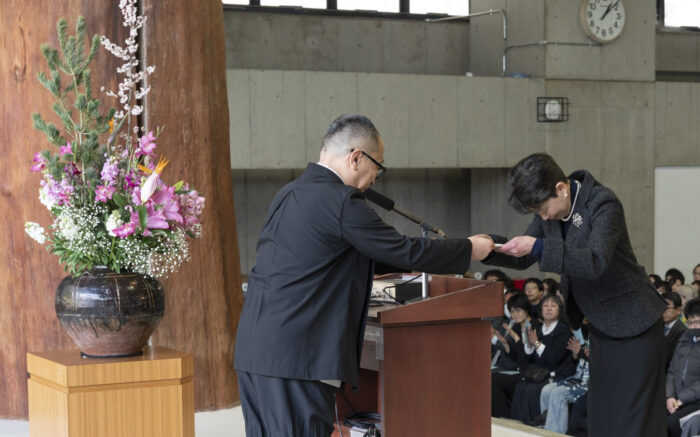 そして、学科ごとに卒業生・修了生代表の方へ「学位記・卒業証書授与」が行われます。学生のみなさんそれぞれへの授与は式典後の分科会で所属のコース教員からひとりひとり授与します。