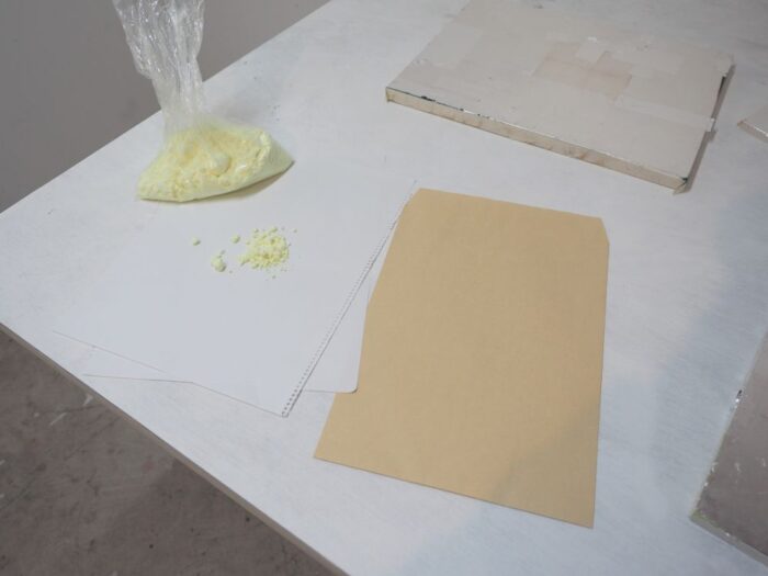 まずは粉末タイプの作業方法です。硫黄を大きな紙の上にひろげるか、封筒の中に入れます。ある程度広い面積がとれるよう紙全体にまぶすように広げるのがポイントです。