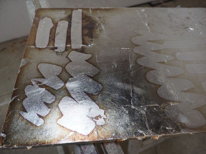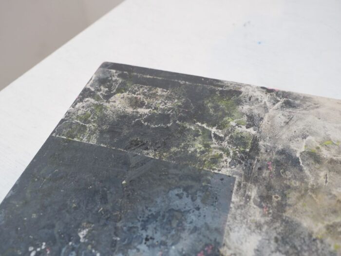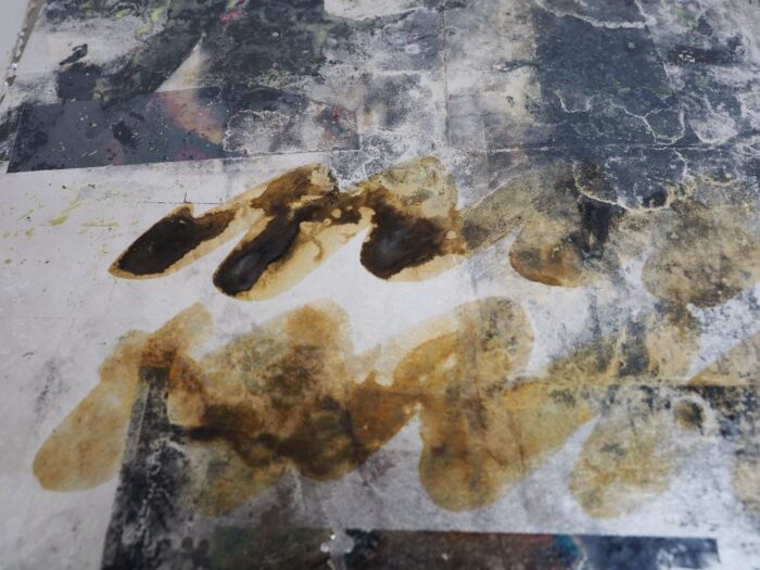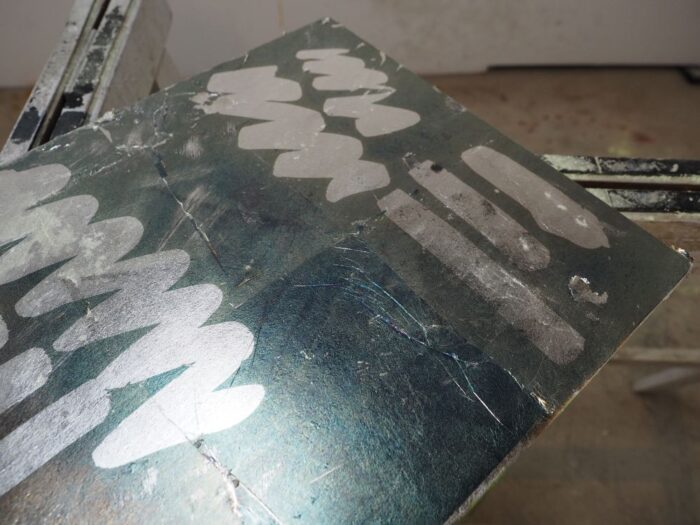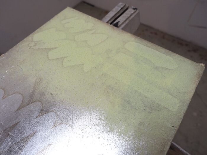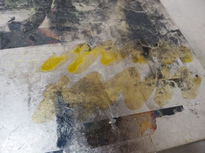 硫化後は画面を水などで洗い流してあげないと任意の変化具合で留めることができなくなります。洗い流すときは、箔ごとはがれてしまわないように、使い古した刷毛などで何度かやさしく拭きとるようにしましょう。
