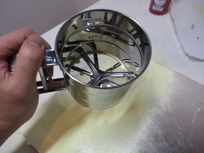 篩を使ってまぶすと視認できる粉の範囲よりも広く撒かれており、巻いたつもりのない場所もじんわりと変色していました。変色にグラデーションを作りたい時などに便利かもしれません。