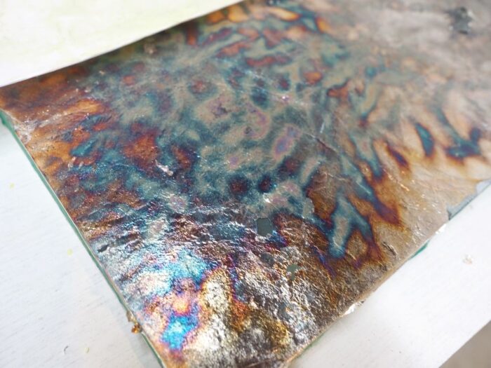 粉末の硫黄は時間をかければ画面に撒くだけでも箔の色を変化させることができます。上の写真でおおよそ5時間程度放置した状態です。