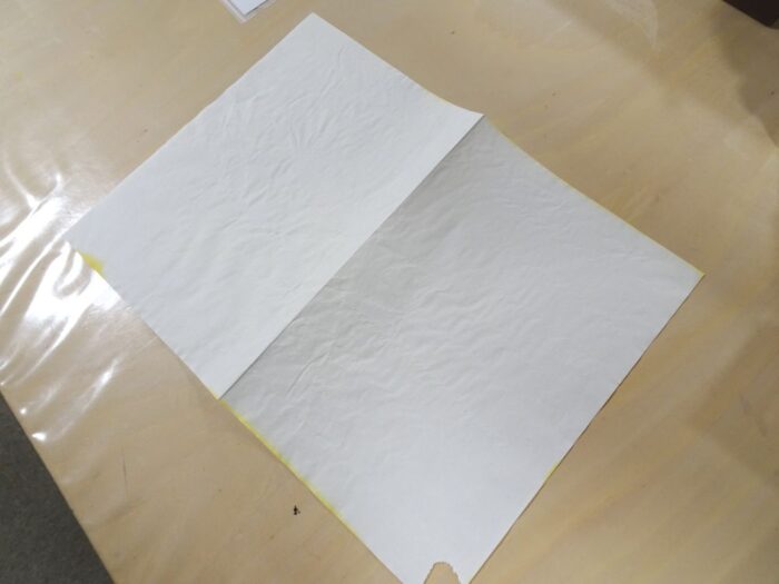 こちらのように硫黄液に紙や布を浸して乾燥させた「硫黄シート」というものを自作して使用される作家さんもおられるようです。今回は山本雄教先生にお借りしています。紙の端の黄色い部分は硫黄成分だそうです。