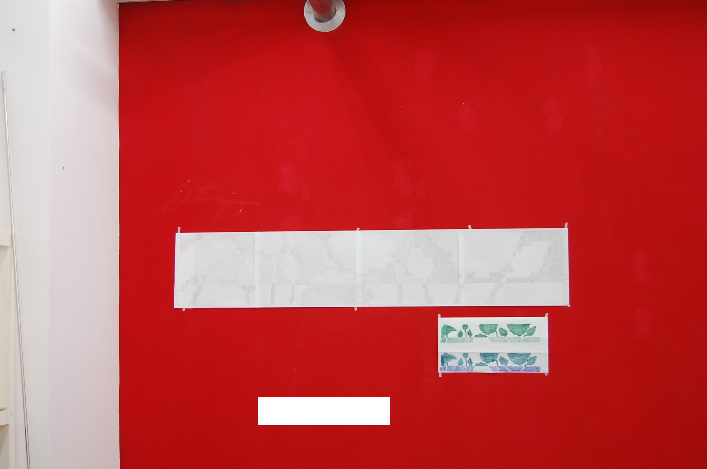 写真8 デザインは実物大に拡大します。壁に草稿を貼って離れたところから見るとよくわかります。描いては消し、描いては消し、少しずつ形を直していきます。