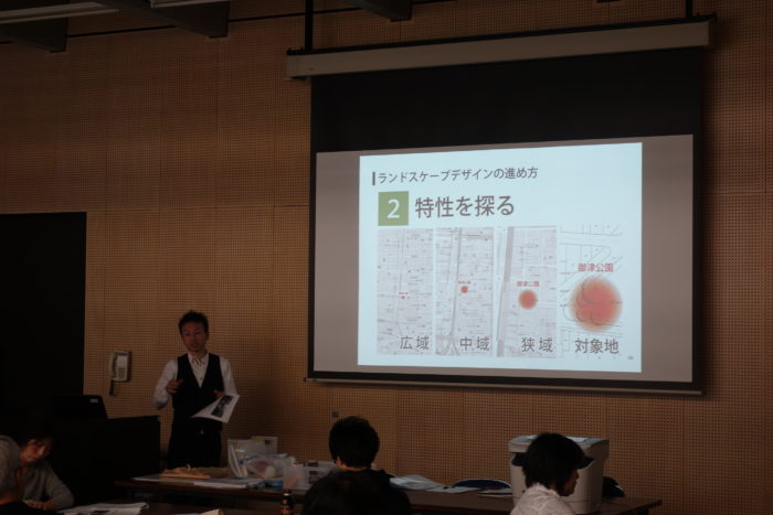 まず、ランドスケープデザインの進め方や多様な視点を持つことによる対象地の解析について、石井先生からレクチャーを受けます。