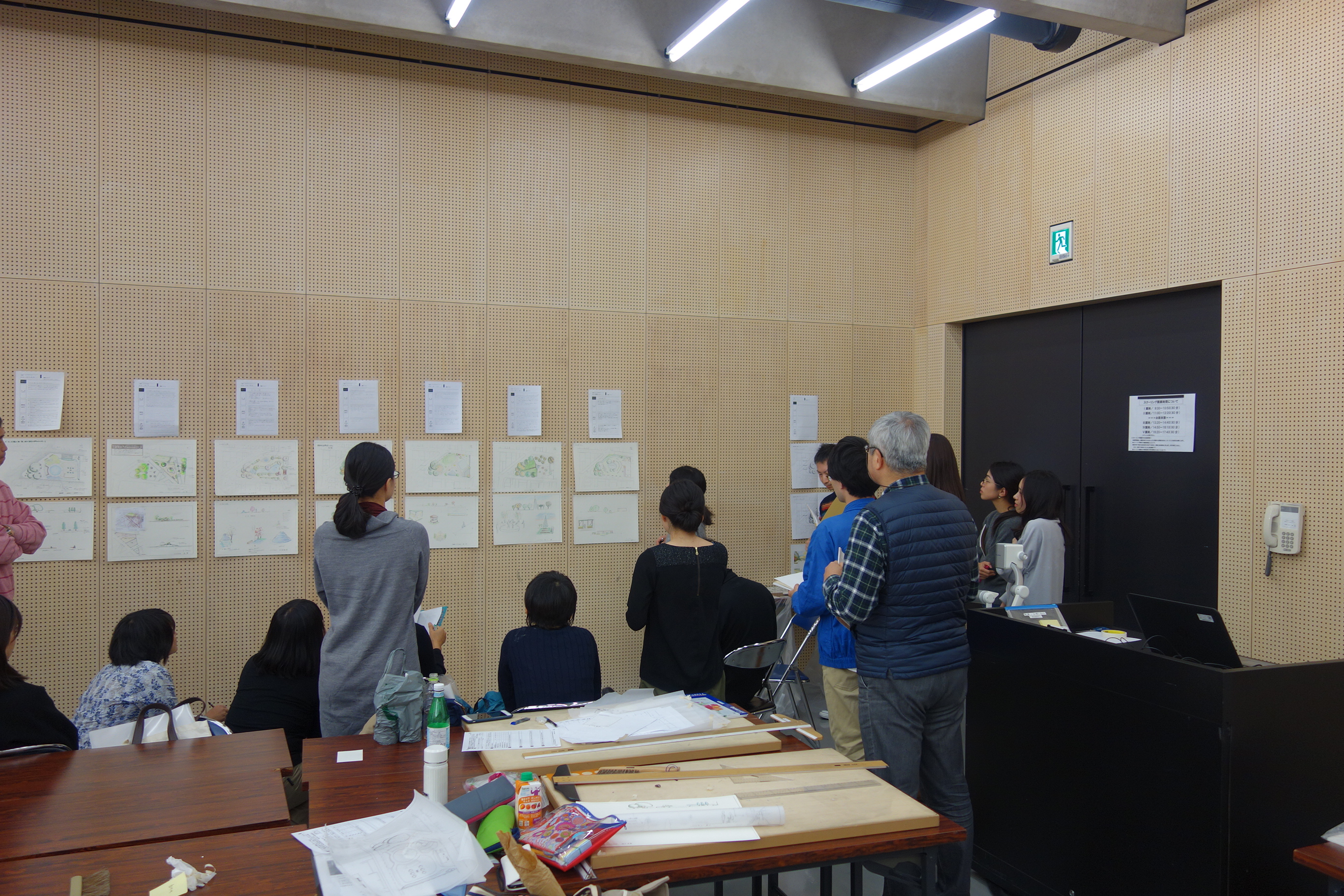 最後に設計のスクーリングでは、全員のプレゼンシートを壁に貼って、一人ずつ作品について発表します。