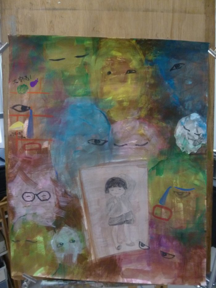完成イメージを持ちながらも、キャンバスに様々なアプローチをしイメージを広げるHさん。途中経過をあらためて見返すと面白いですね。