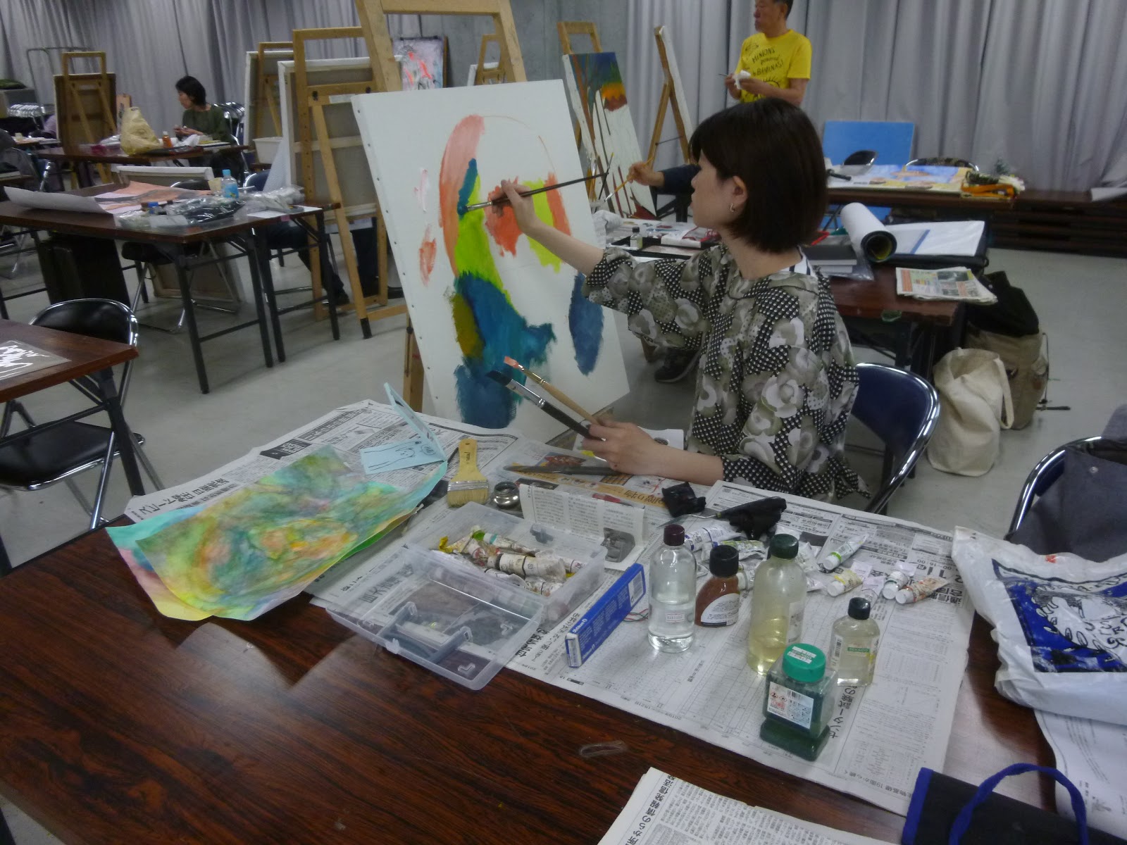 キャンバスを寝かせて制作されていたSさん。