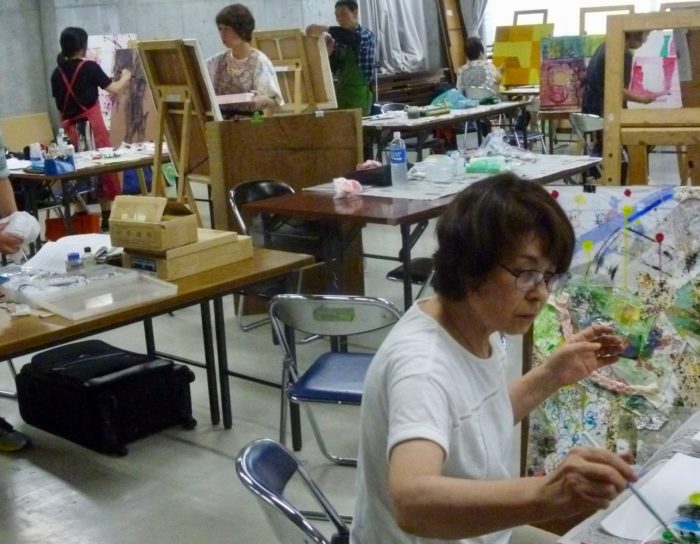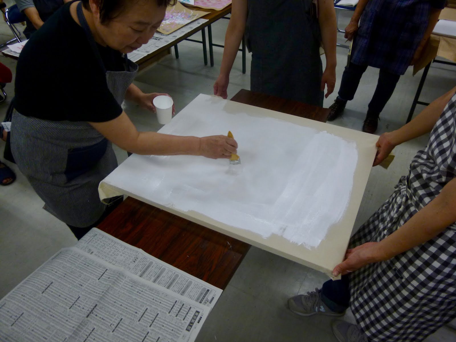後半日程の制作で綿布を張ったパネルを使うため、布張り、地塗りの実演を行い、ジェッソでの地塗りも体験してもらいました。地塗りしたパネルは後半日程の事前課題です。