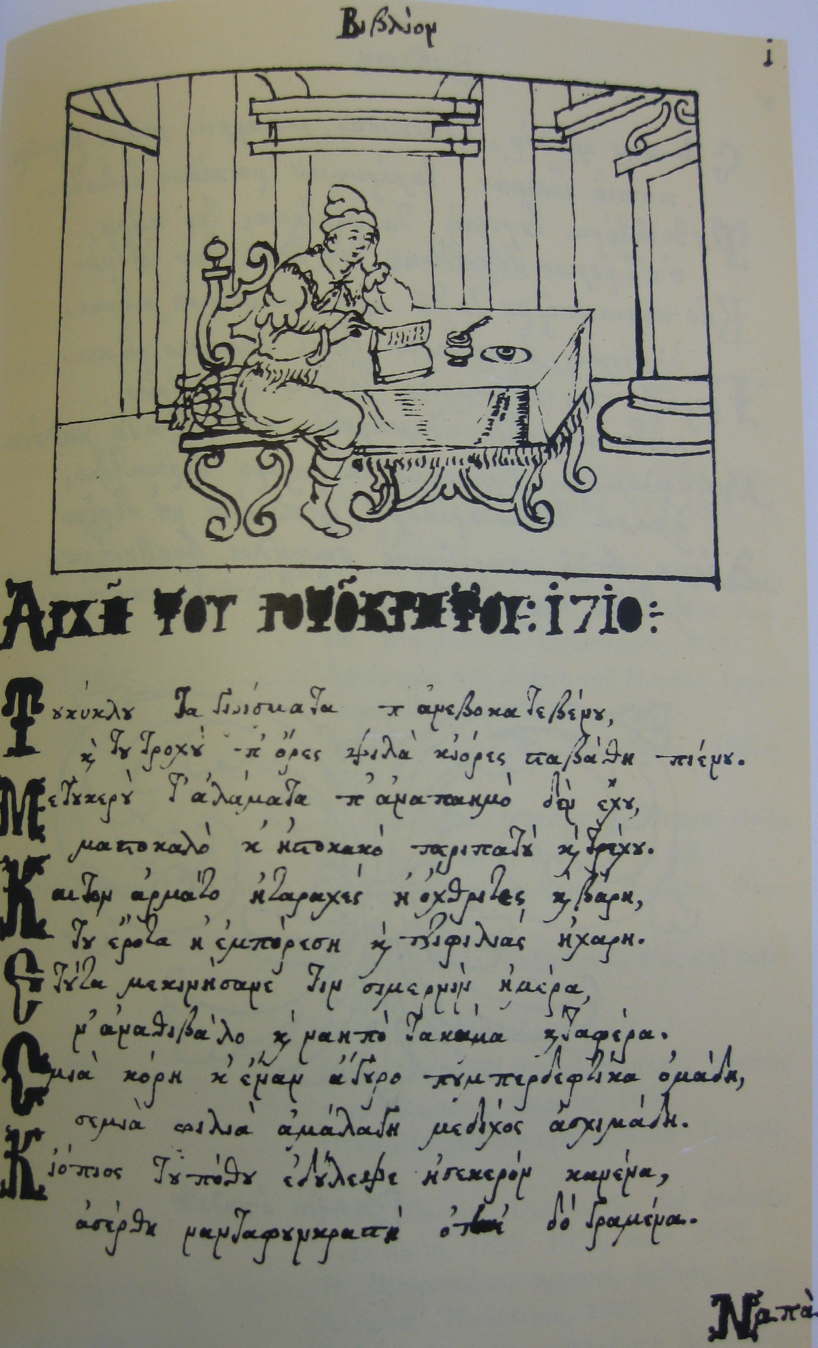 また、上述の先行する物語は散文でしたが、『エロトクリトス』は韻文で書かれており、それもクレタ独特の15節韻律が用いられています。下の写真は、この作品の冒頭部分です。