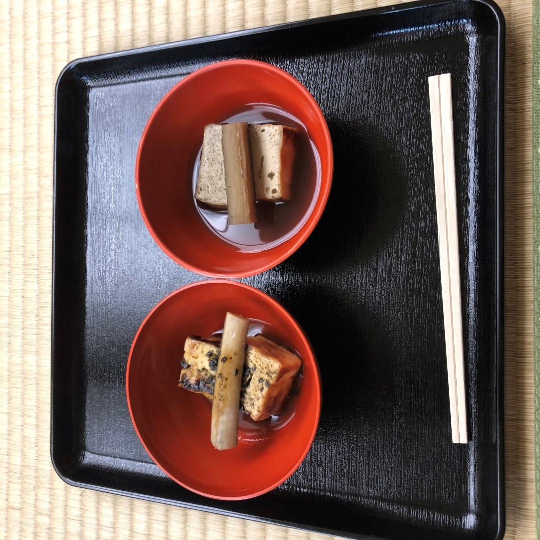 途中、少し眠気に襲われましたが、王祇祭は当屋頭人のご長寿を祝う意味でもあるので頑張りました。当屋では、お酒・お菓子・手作りの凍み豆腐が振舞われました。朝を迎えると、すこし仮眠をして、春日神社に戻られた王祇様と一緒に能を楽しみます。夕方18時に全ての斎行が終了しました。こんなに長い時間、能を鑑賞したことは初めてでしたが、目が離せない演目やしきたりが沢山あり圧倒されました。心地よい疲れの中、帰路につきました。