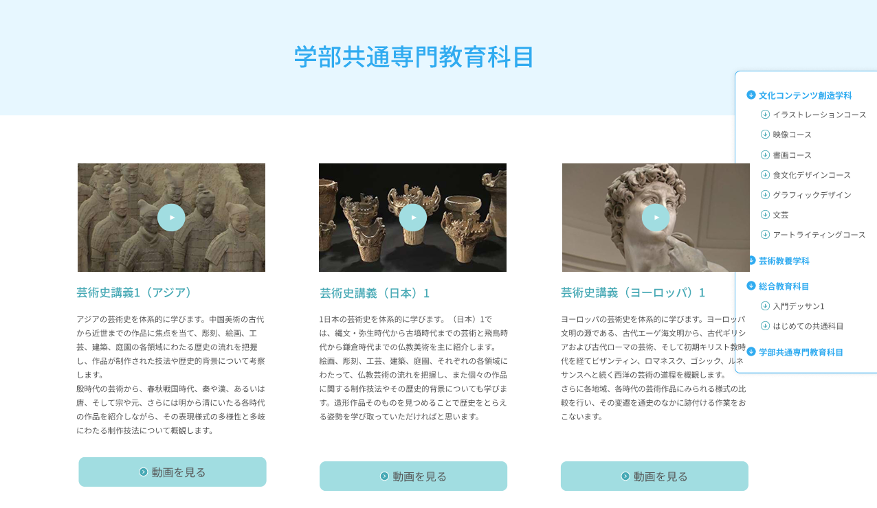 Webスクーリング科目とは、動画教材を中心に学習を進める科目です。全15章の動画を視聴し、章ごとに選択式の確認テストに解答。終了後、レポートに取り組みます。すべてのコースで受講できる「芸術史講義」や、文化コンテンツ創造学科のイラストレーションコース・グラフィックデザインコース・映像コース・食文化デザインコースの必修科目がこのWebスクーリングの形態となっています。