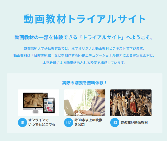 「動画教材トライアルサイト」では、本学に入学される前の皆さんに、一部の動画教材を公開しています。