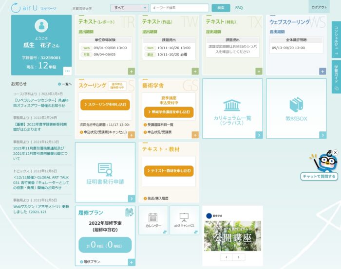 こんにちは。京都芸術大学通信教育課程 入学課です。 本学通信教育部では、「airU(エアー・ユー)マイページ」という学習用Webサイトを活用して学習を進めます。…