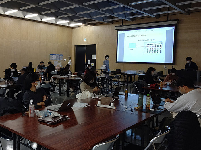Premiereをマスターするために、事前課題でスマホやカメラで撮影した動画をストーリーに沿って編集し、完成したものをプロジェクターで順番に発表していきます。