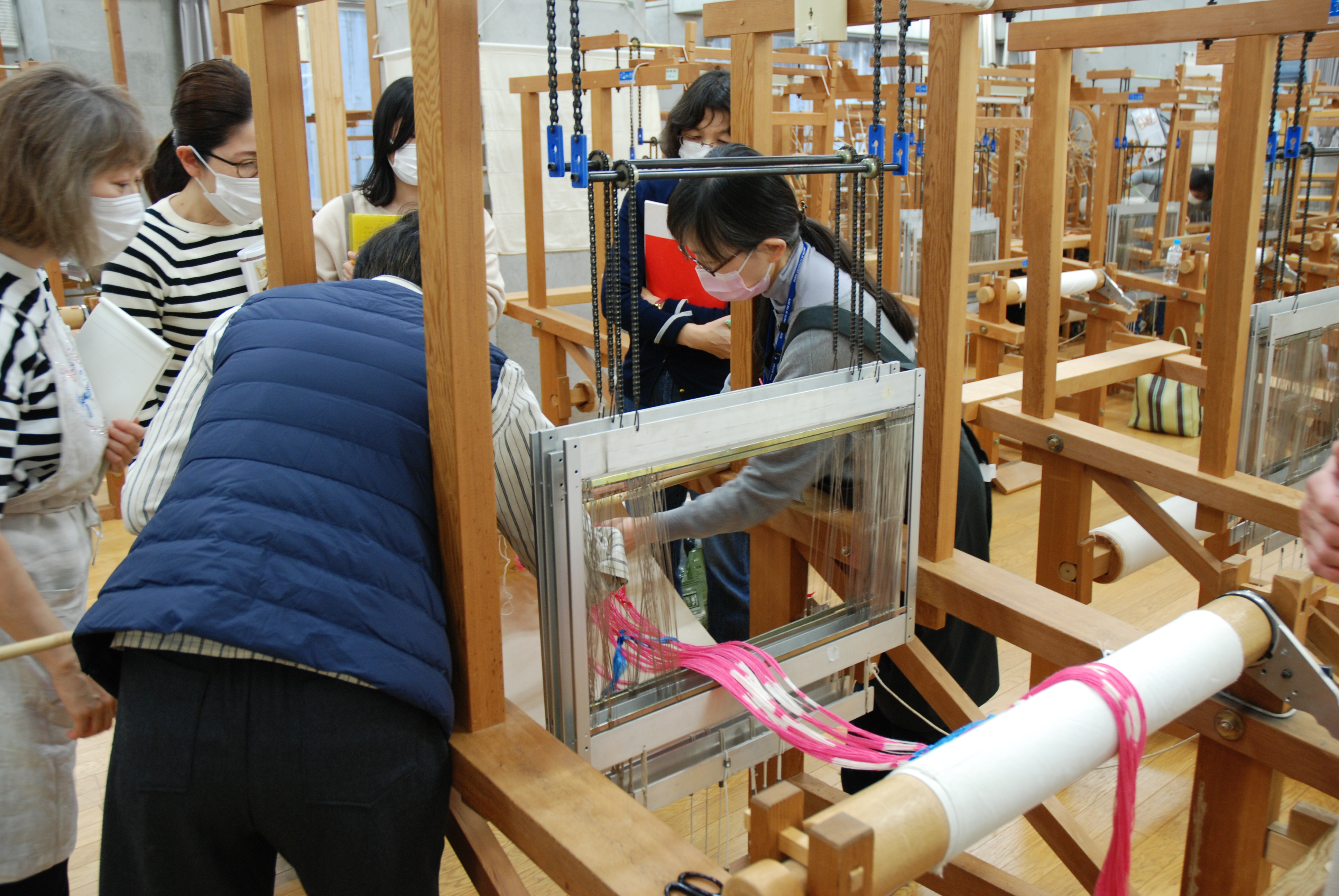 さて2日目。織りはじめます。絹糸はたて糸本数が多いので引き続き準備作業が続きます。織りはじめてみると糸を通し間違っているところがあったり、ひと目飛ばしてしまっていたりすることに気づくことがあります。丁寧に直していくのはとても根気のいる作業です。