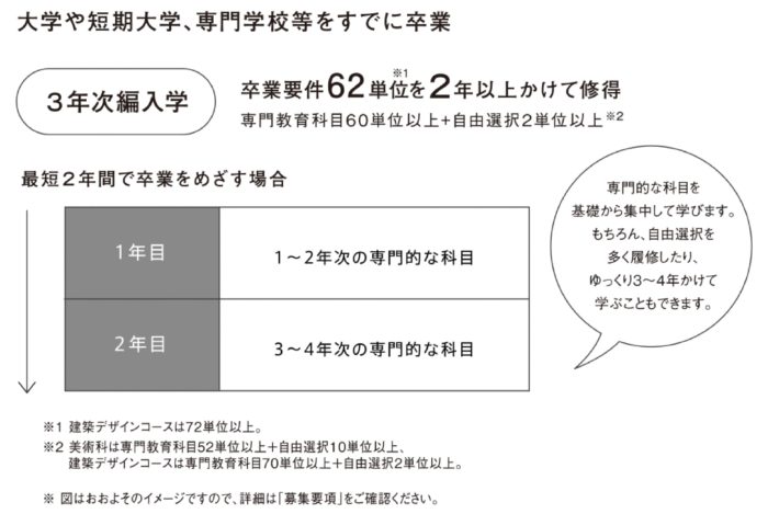 本学の場合、3年次編入学の方の卒業要件は「2年以上在籍し、62単位を修得」です。