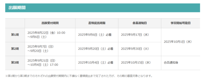 第2期の出願期間(9/20(土)までに出願手続きを完了すれば最短の10/1(水)から学習をはじめられます。