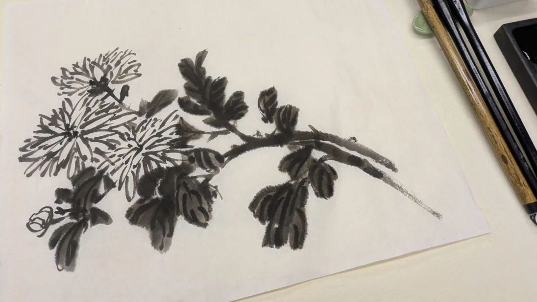 四君子(梅・蘭・菊・竹)は水墨画の基本的な画題として初学者にも親しまれています。その中で墨菊は長寿や高潔さを象徴する存在として多くの人を魅了してきました。今回は墨線による造形に加えて「線」と「面」の関係に注目しながら菊の雰囲気と立体感を表現してみたいと思います。