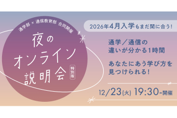 「本学通信教育部の学び方」や「大学で学ぶ意義」など、皆さまの疑問や不安を解消するスペシャルイベントを東京・外苑キャンパスにて開催します。