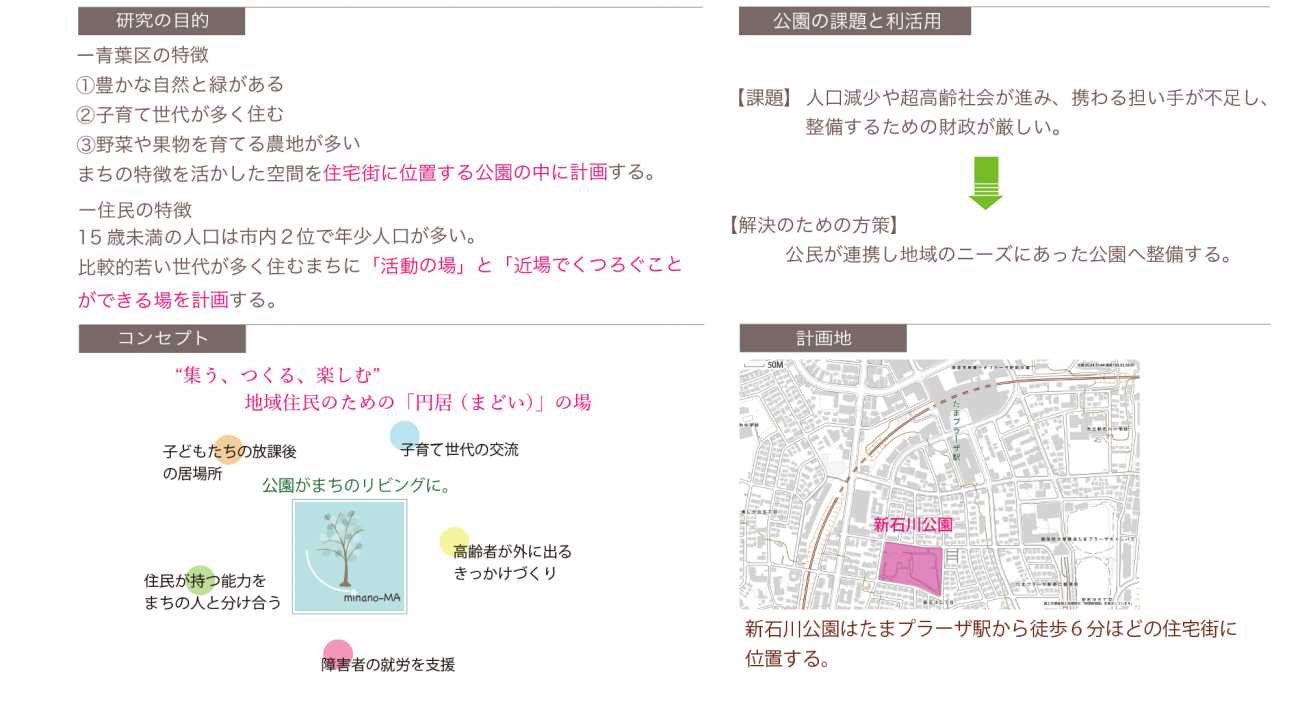 私は地域の住民とまちをつなぐ場である公園に、様々な世代の住民がともに過ごす家の延長のような空間が生まれたらと思い、公園を「まちのリビング」として捉えました。そこで活動したり、放課後の居場所になったり、仕事や学びが生まれたら、あたたかでとても魅力的な場所になることでしょう。