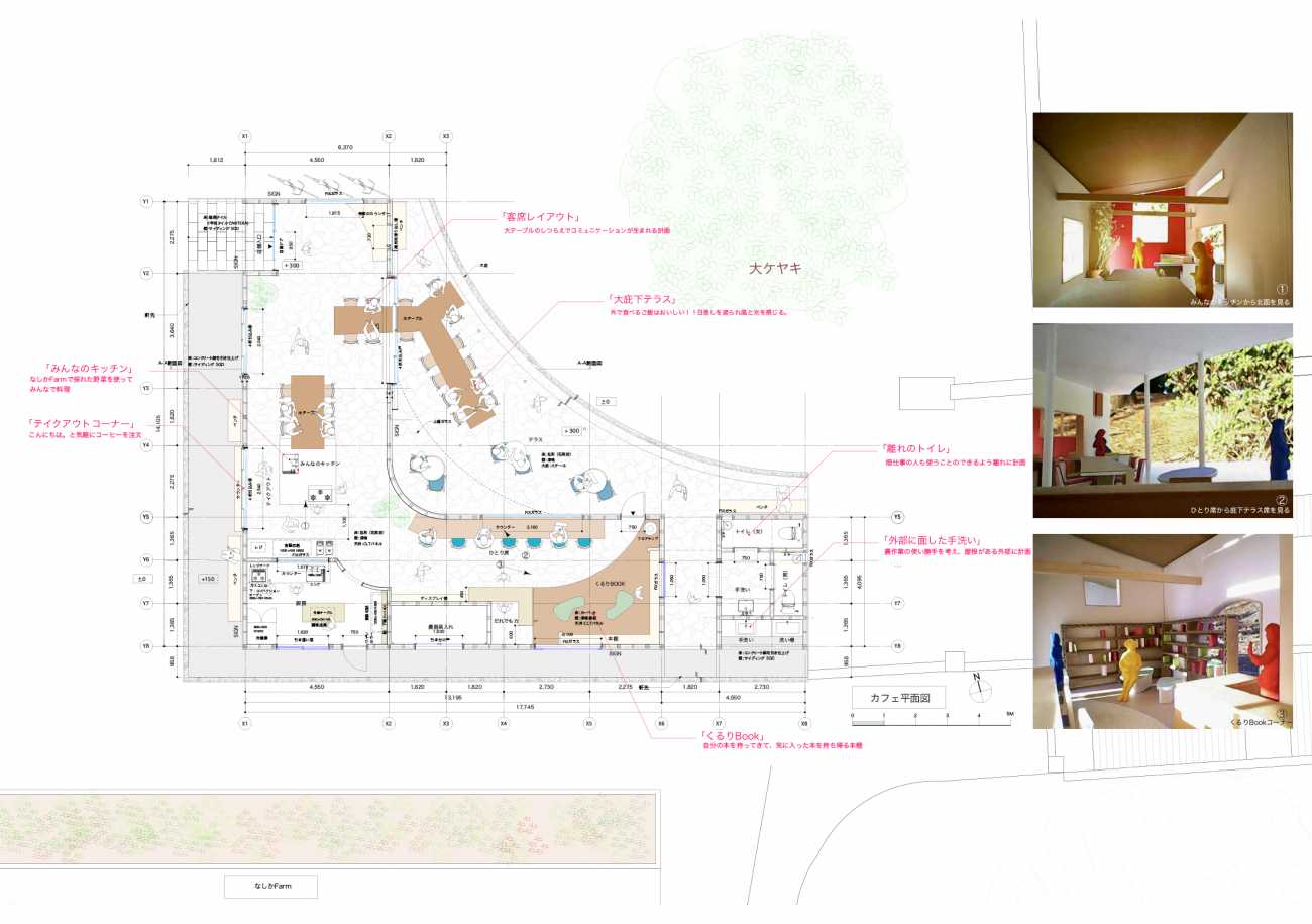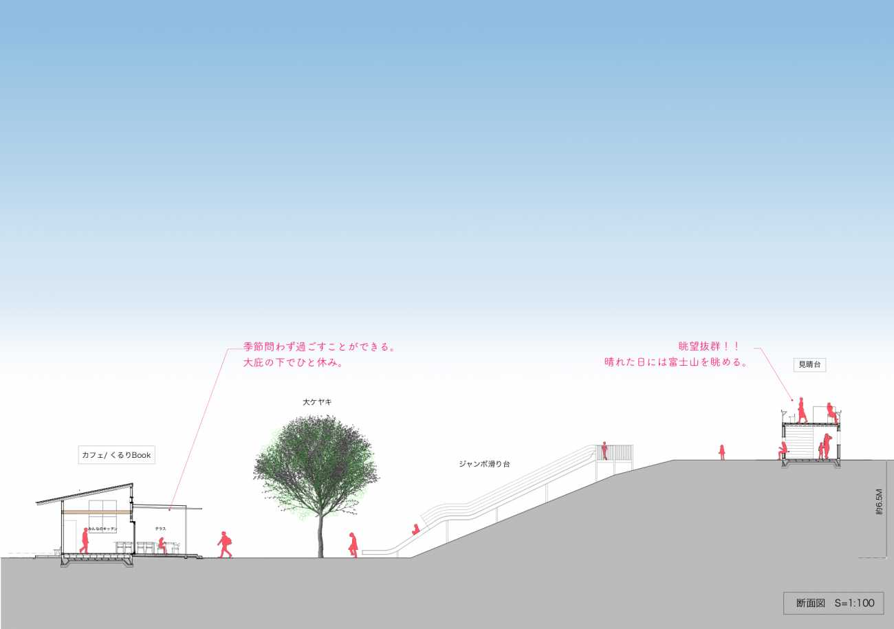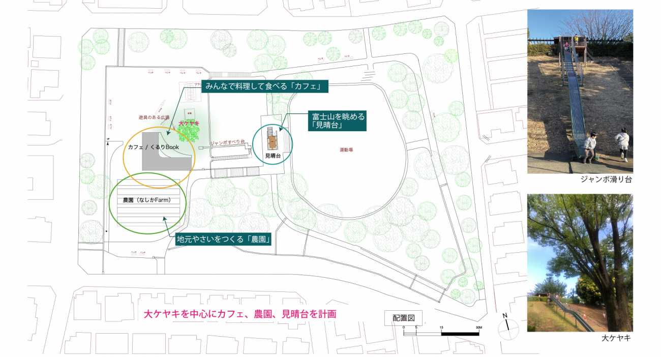 新石川県公園で着目したのは、高低差がある土地の形状と、子どものみならず大人までもワクワクするジャンボ滑り台 があること。 そして見守るようにどっしりと構えた大ケヤキがある。 この特徴を生かし、見晴台、カフェ、そして農園の大きく3つのゾーンを計画。