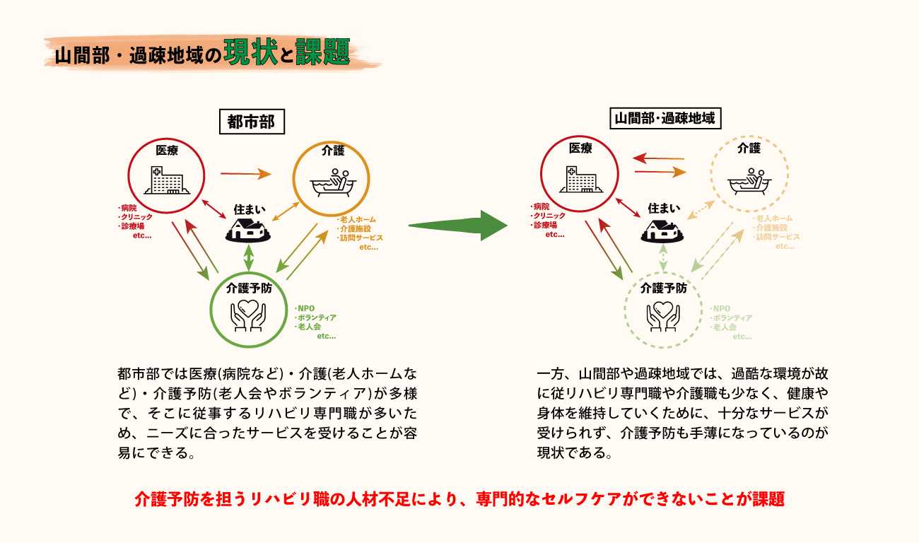 山間部や過疎地域では特に高齢化も深刻であるが、介護予防を担うリハビリ職の人材不足により、専門的なケアが受けられず、自宅を離れなければならない方々もたくさんいる。