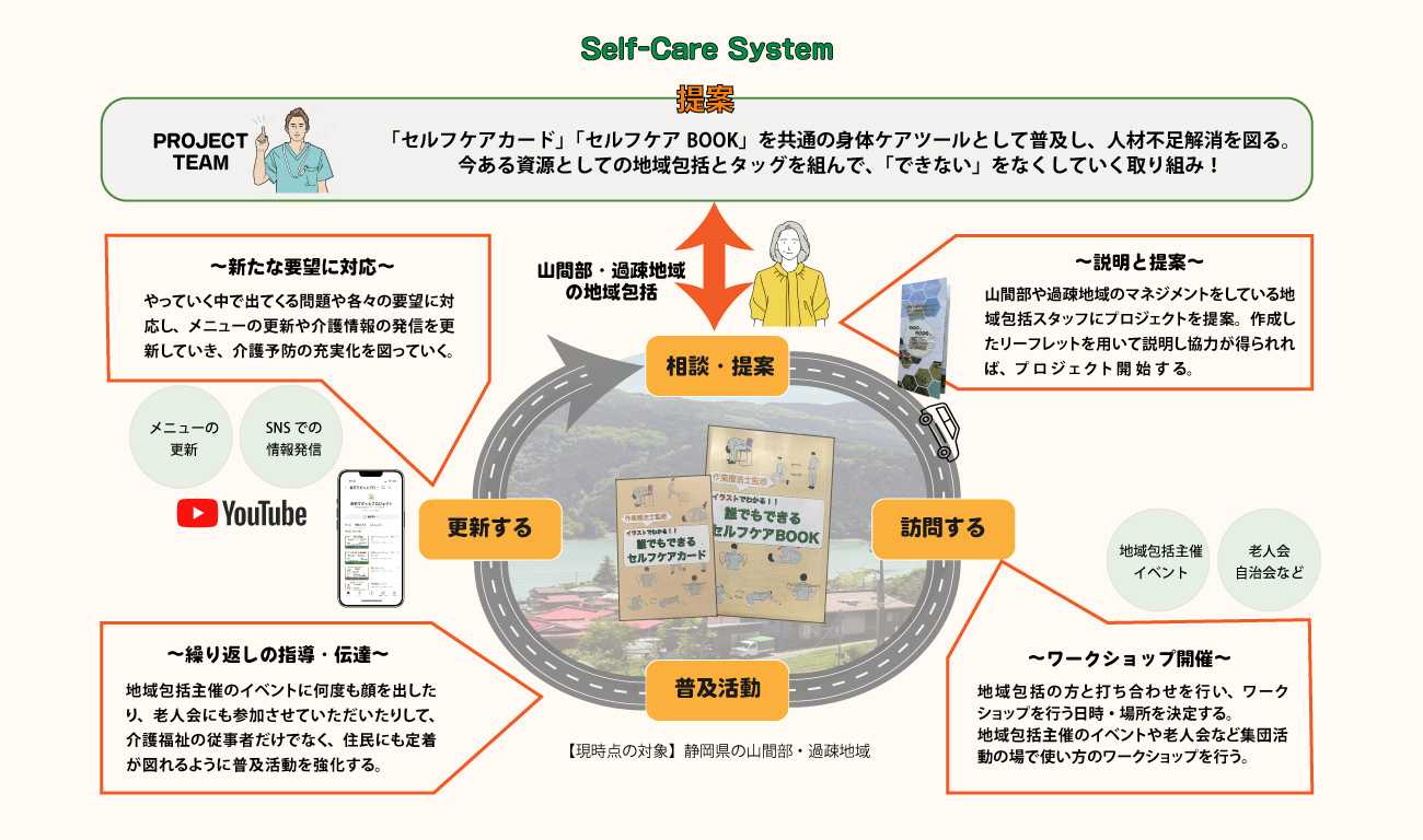 山間部や過疎地域には頻繁に訪問したり、人材を集めて住まわせたりすることが現実的に難しいため、誰でも簡単に自身の身体を評価し、自分に合ったセルフケアができるようなツールが必要であり、それらを普及し、地域包括と密な連携をとることで、人材不足でも健康な身体を維持できるシステムを構築できると考えた。