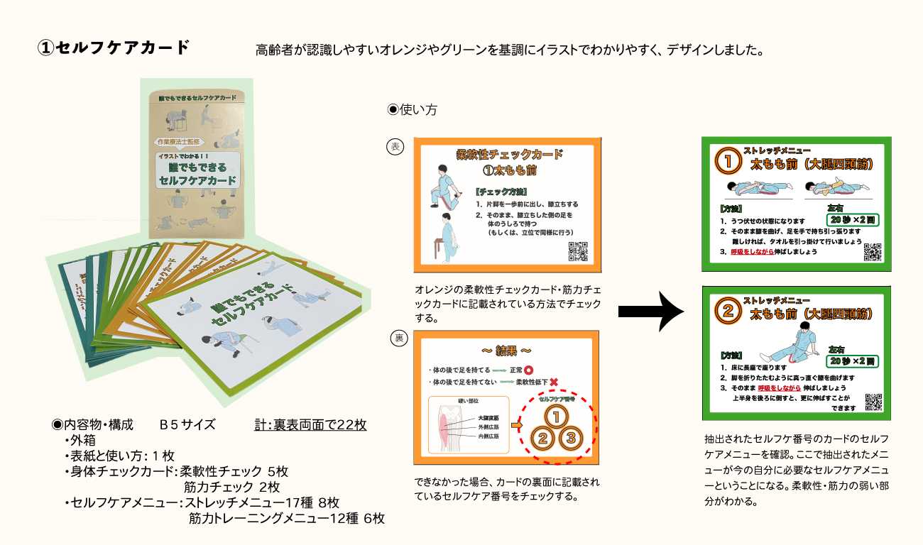 セルフケアカードは、基本的には地域包括スタッフや介護・福祉の従事者が使用することを考えてデザインしている。