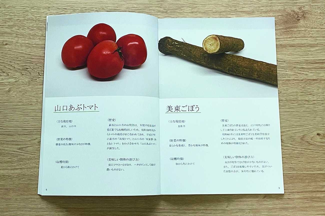 山口県の伝統野菜や地野菜をもっと知ってもらうために制作した“Yamaguchi Vegetabook”では、山口県の様々な伝統野菜や地野菜の情報や、伝統野菜や地野菜を使用したおやつのレシピを紹介しています。