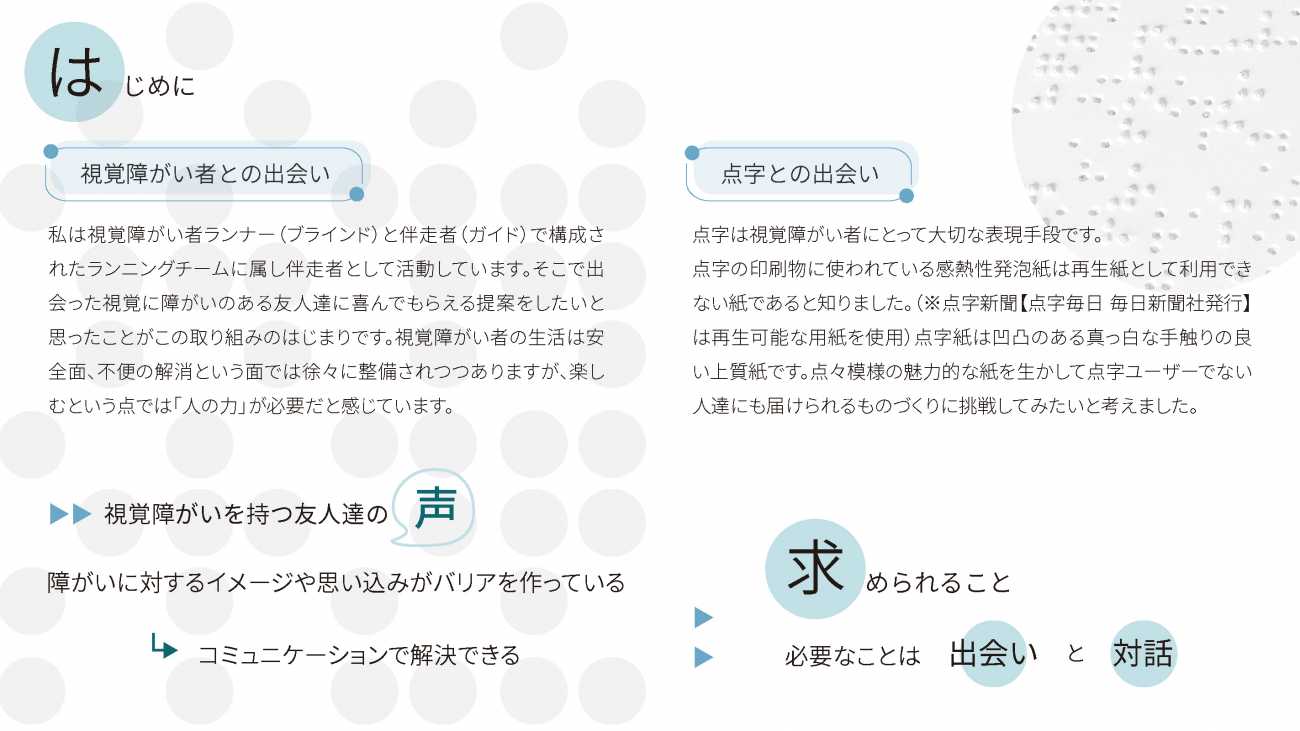 研究テーマ:視覚障がい者(見えない・見えづらい人)と晴眼者(見える人)をつなぐカタチの追求