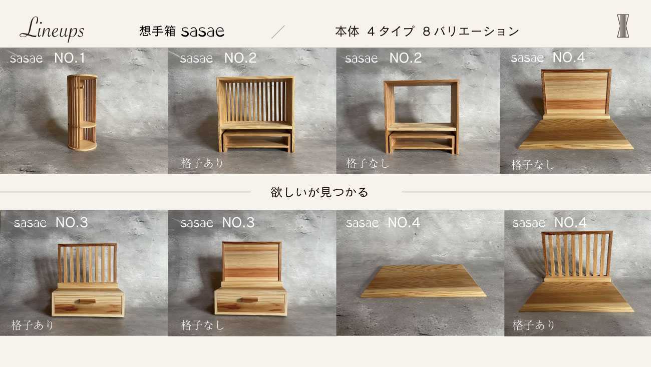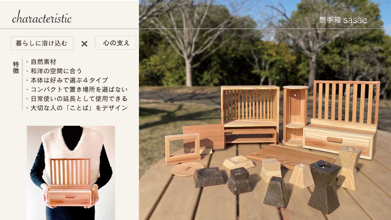 想手箱は仏壇でも神棚でも飾り棚でもない、大切な人を想う手箱です。プロダクト名は作品名である「sasae」としました。
