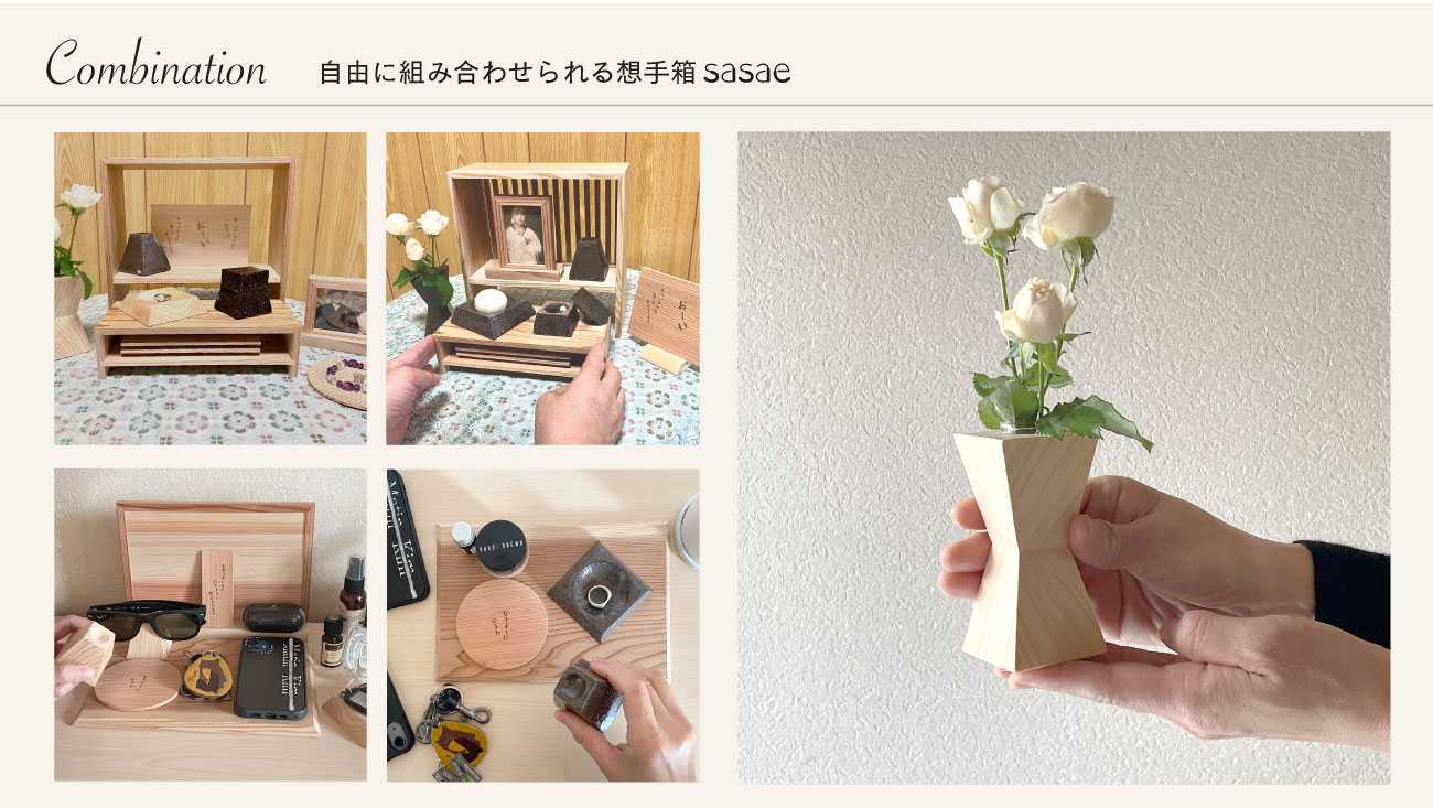「sasae」は、大切な人を偲んだり、時には自己を見つめるきっかけとなり、組み合わせ次第で思い思いの祈りのカタチをつくることができる想手箱です。大切な人への想いは人それぞれ。本体と関連アイテムからなる「sasaeシリーズ」で、自分のライフスタイルに合った、「大切な人の新しい想い方」が見つかります。