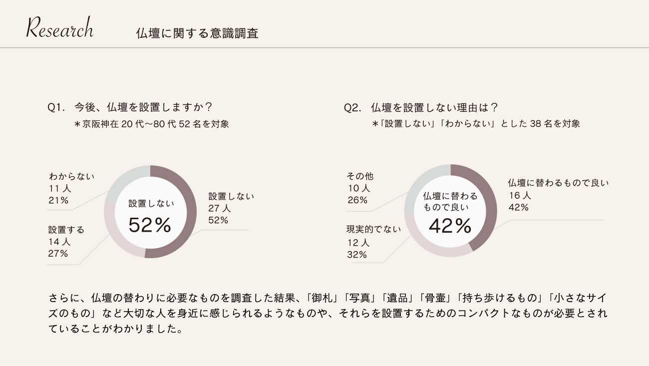 仏壇のインタビュー調査を行ったところ、ライフスタイルに合わないなどの理由から、仏壇の関心は薄れ、今後設置を考えている人は極めて少数でした。一方で、誰しも大切な人を想う気持ちに変わりなく、想い懐かしむことで癒され心の支えとなり、穏やかな日常を願う人が多くいることがわかりました。