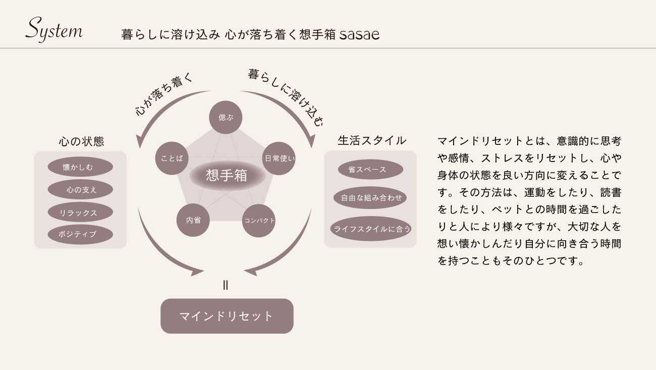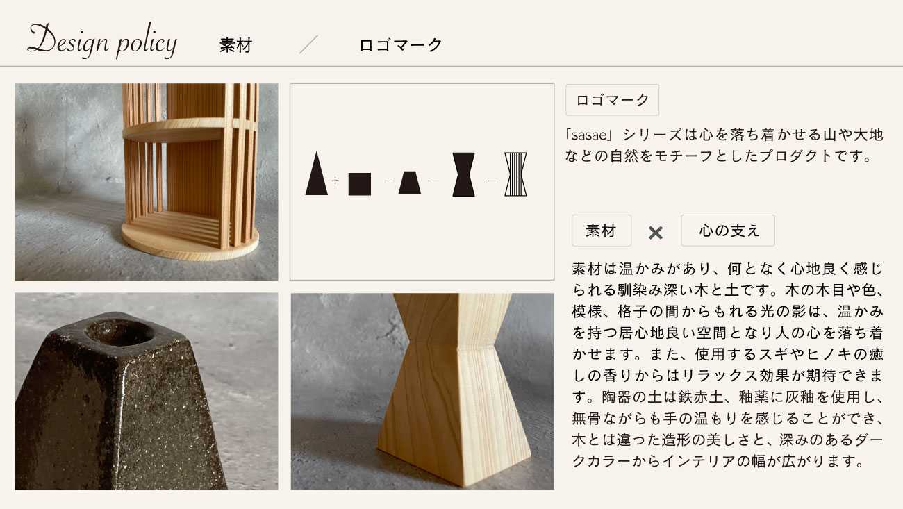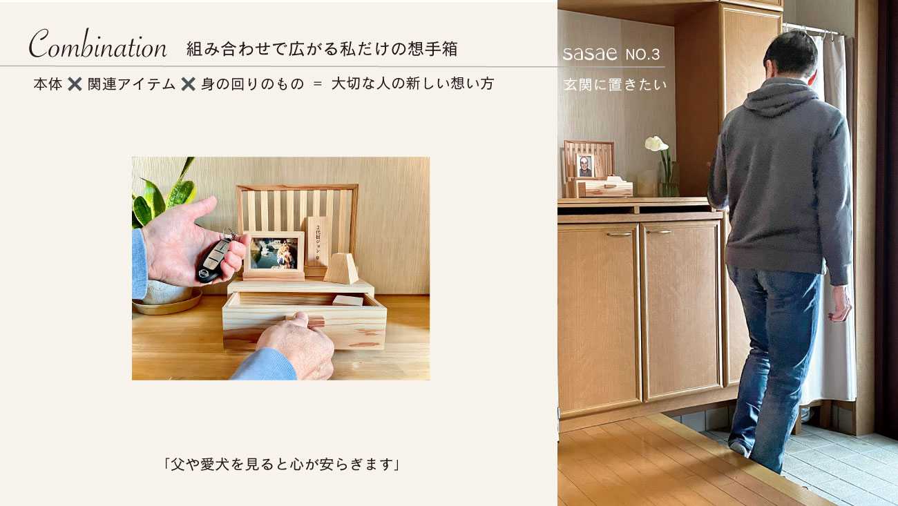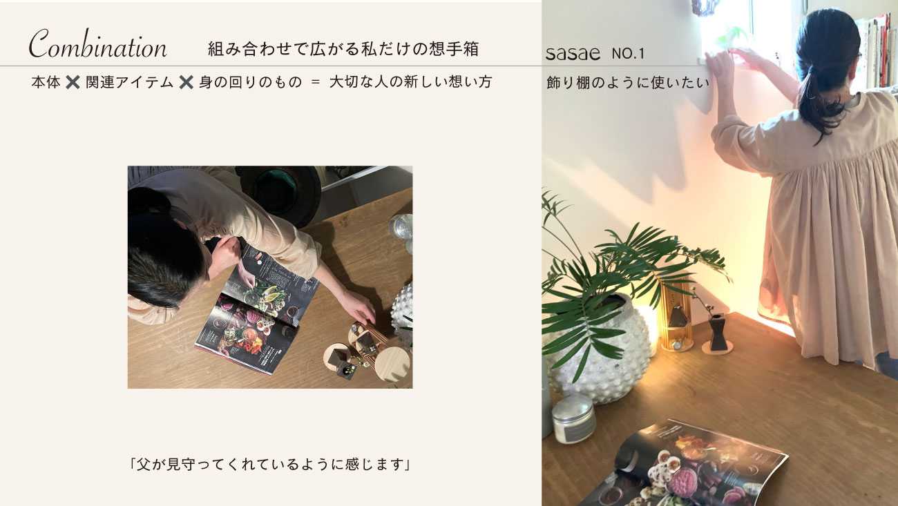 暮らしの中で大切な人を想い懐かしんだり、自分に向き合う時間=「sasae時間」sasaeシリーズの大切な人を偲ぶアイテムと、普段使いの身の回りのものを併用することで、暮らし中に「 sasae時間」がゆっくりと時を刻みます。