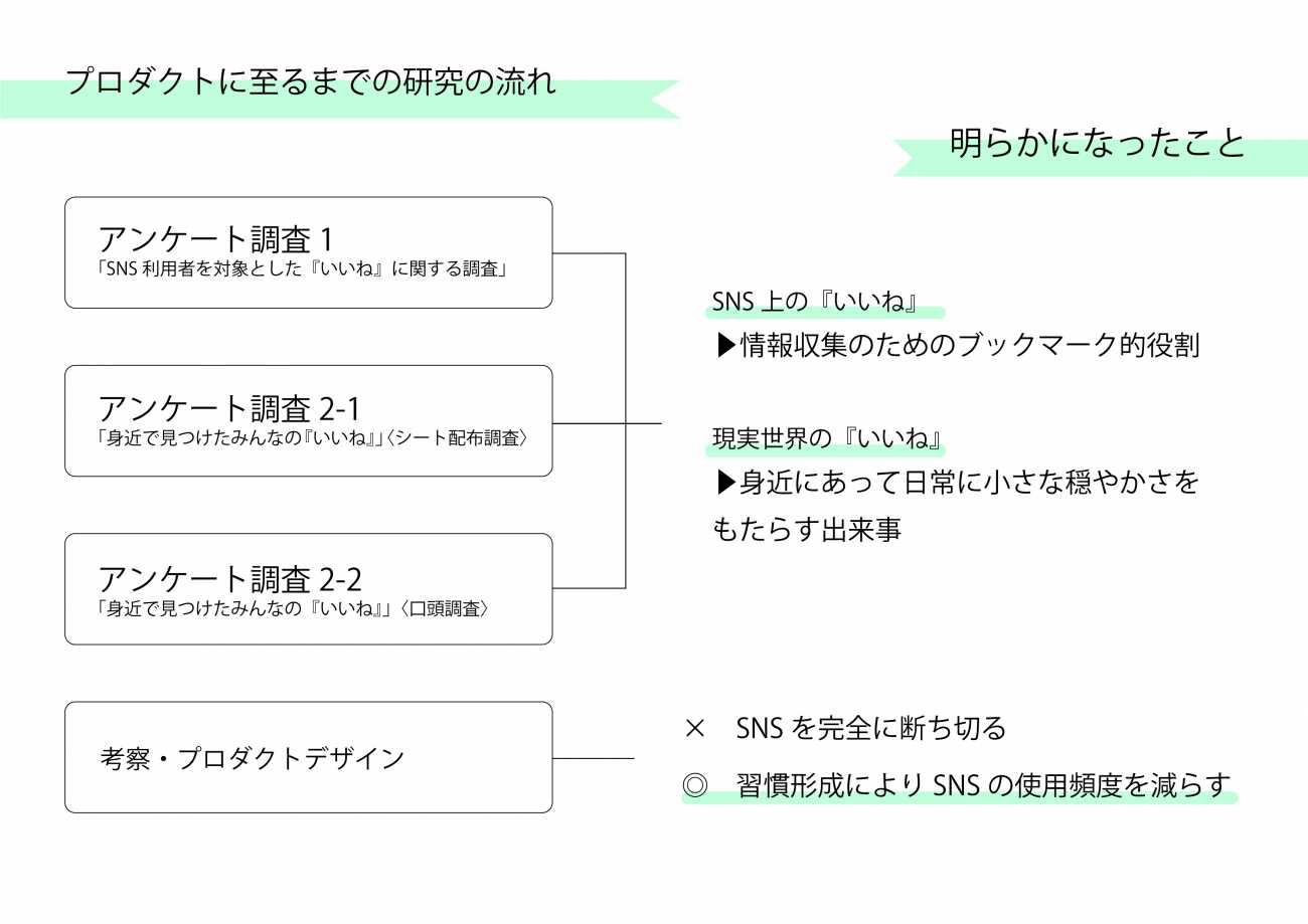 研究にあたって、複数のアンケート調査を行い、そこから得られた結果と考察を元にプロダクト制作を行いました。