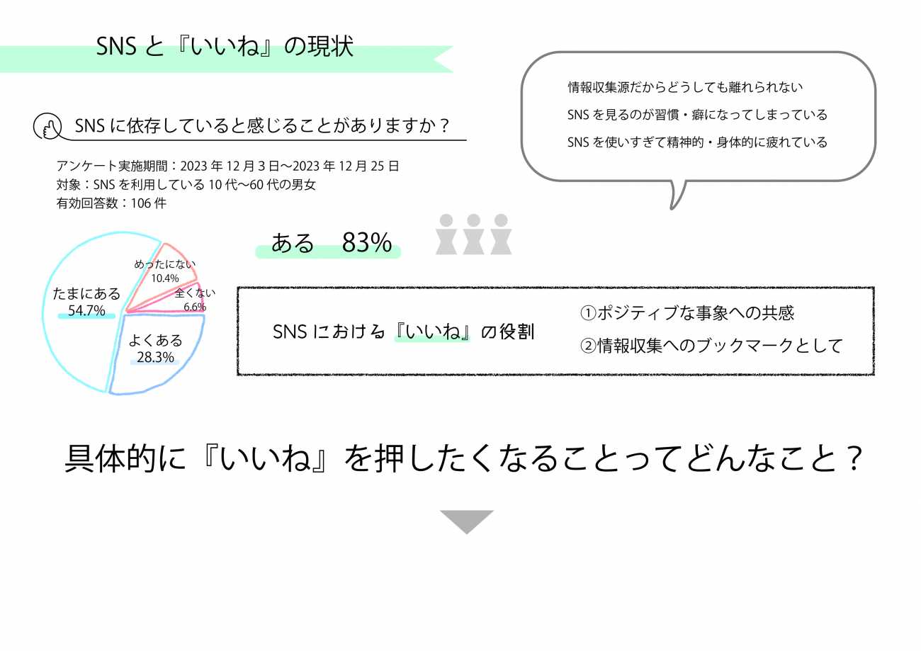 1つ目のアンケート調査では、SNSの使用は現代人にとって、情報収集の手段として必要不可欠になっている現状が明らかになりました。一方で情報収集ではない『いいね』を押したくなることは具体的にどんなことなのかについて追加調査を行いました。