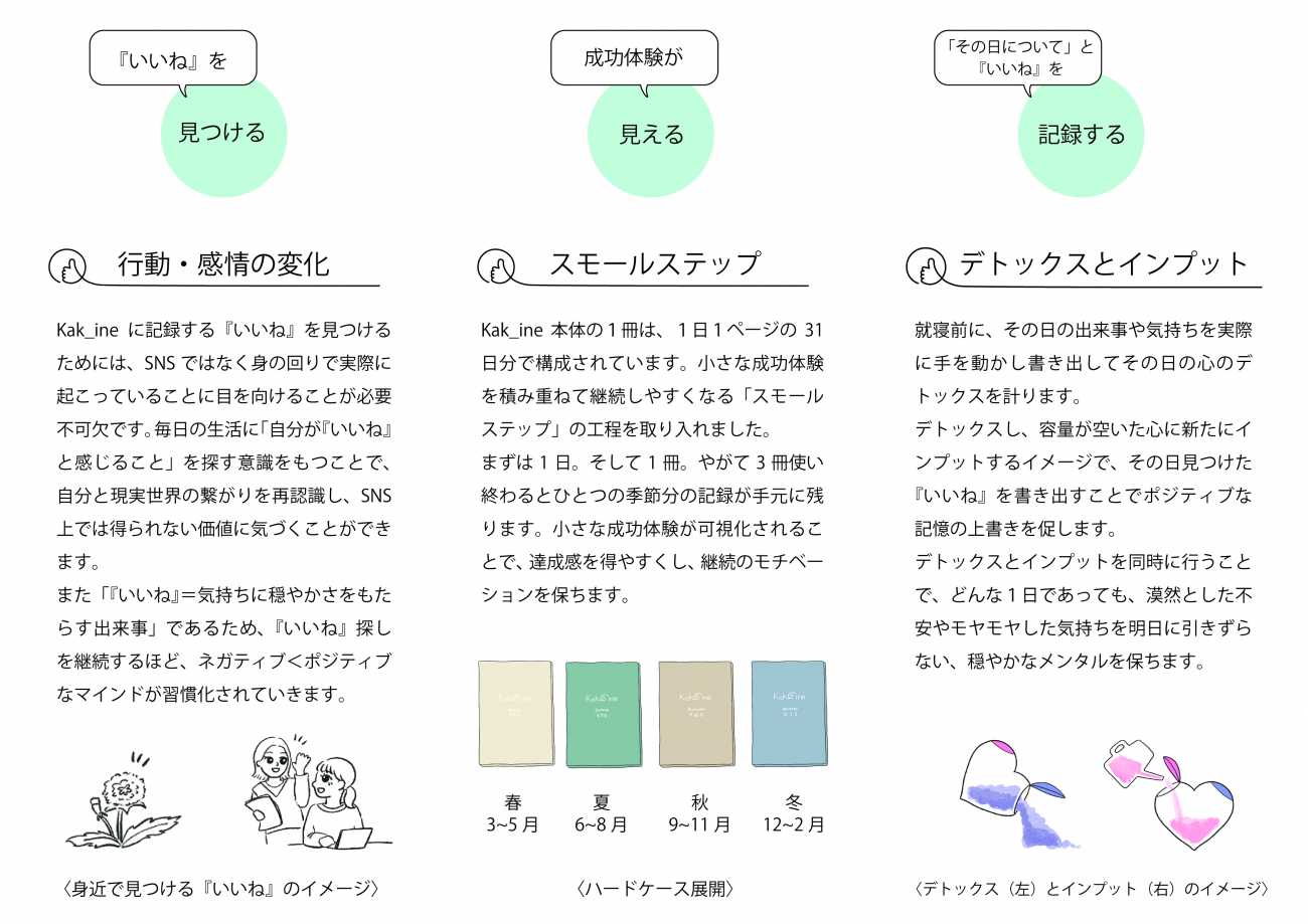 Kak_ineを使用することで、SNS以外の世界へ目を向ける習慣を形成し、自分を取り巻く世界の価値に気づきSNSとの付き合い方の見直しへ導くことを目的としています。"