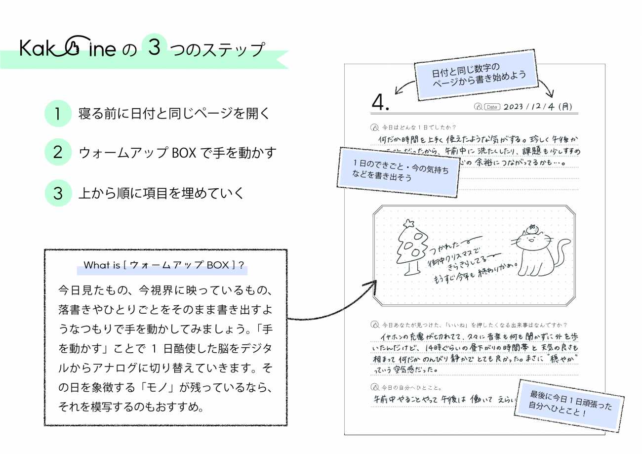 『ウォームアップBOX』では、手を実際に動かすことで脳のデトックスを計ります。また“落書きのように気軽に取り組む場所”とすることで、日記が続かない理由の一つとしてある「完璧に書かなければ、綺麗に書かなければ」という意識を払拭し、最初の一歩を後押しする役割も担っています。