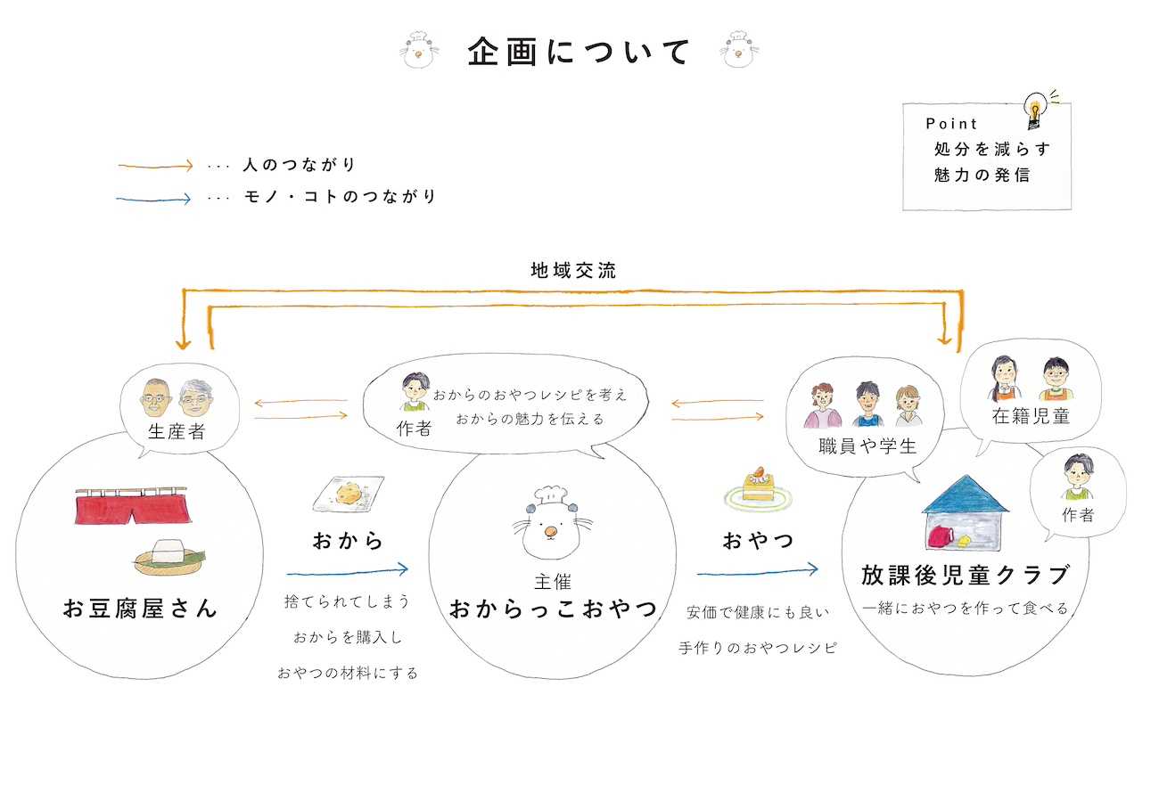 活動の拠点は石川県金沢市。夫婦で営む小さな豆腐屋、「高山豆腐店」に協力していただきました。高山豆腐では毎日10kg以上のおからが処分されていました。これらのおからを購入し、おからを材料としたおやつを「おからっこおやつ」と名付け、レシピを考えました。そしてそのレシピを元に、金沢市にある放課後児童クラブで作って食べるワークショップを開催しました。この取り組みによって、おからを通じた人のつながり、モノ・コトのつながりが生まれます。