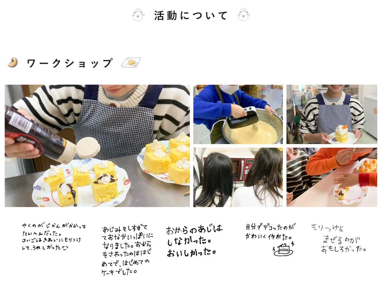 ワークショップで作ったケーキは、材料4つをレンジで焼き上げる簡単なレシピです。児童らと一緒におやつ作るだけではなく、在籍している他の児童や職員に振舞うことも出来ました。ほとんどの児童がおからを食べたことがなく、おからが大豆からできるものだと知りませんでしたが、ケーキを焼きながら夢中漂う大豆の香りに、「良い香り〜!」と夢中になっていました。初めてお菓子作りをするという子もいました。協力して作り、盛り付けをし、時々つまみ食いをしたり、出来上がりを嬉しそうに食べている子どもたちの様子を見ていると、私もおやつを作る楽しさを改めて感じることが出来ました。