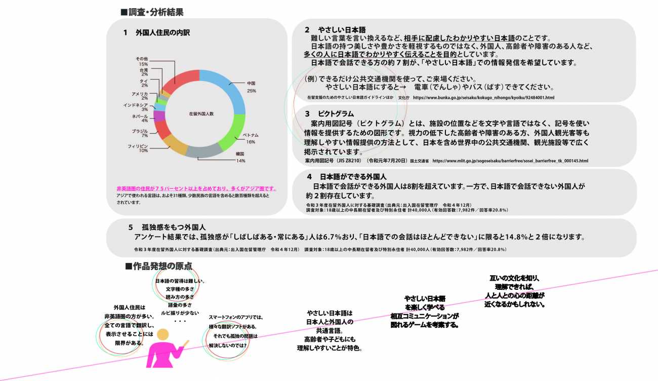 日本に住む外国人は、約75%が非英語圏の方で、多くはアジア圏の方です。全体の約2割の方が日本語が話せず、孤立や孤独を 感じている方も多くおられます。 「やさしい日本語」をゲームで学び、ゲームを通じて会話が生まれ、互いを知ることができれば、暮らしやすくなるのではないかと 思い、このゲームを考えました。